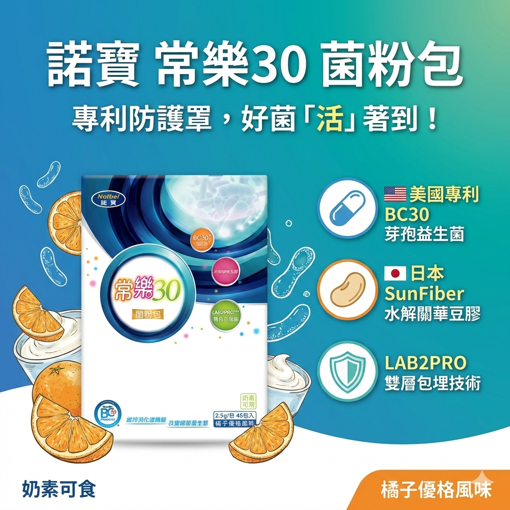 • 強韌專利菌株: 採用美國專利 BC30® 芽孢型乳酸菌,具備優異耐酸鹼與耐熱特性,確保活性發揮。